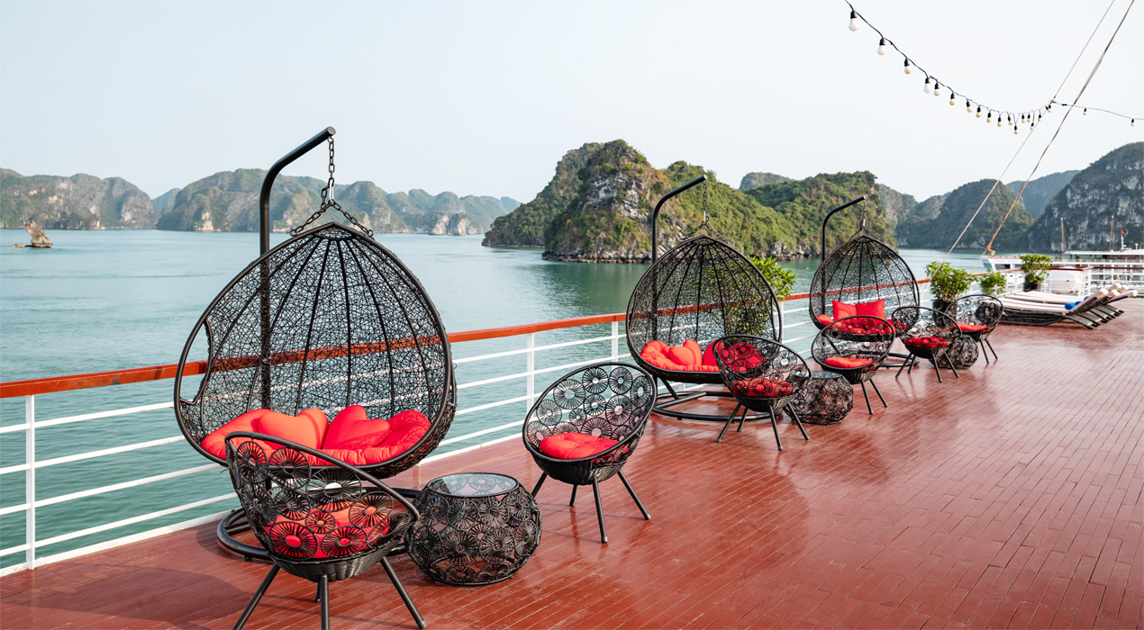 Relax on the cruise. Don’t miss the sundeck area to witness the stunning sunset, join the sunset party and participate in a cooking class featuring authentic Vietnamese dishes.