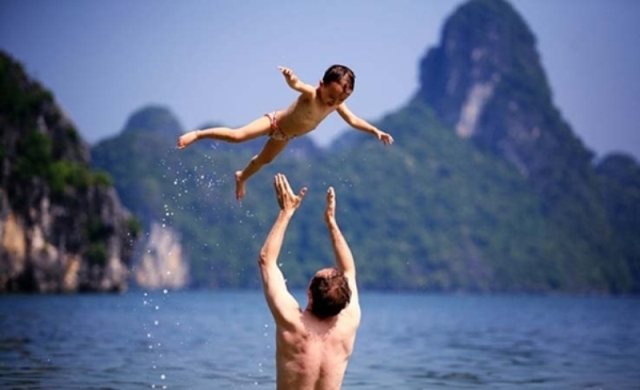 After having a breakfast at your hotel and transfer to Ha Long Bay. Drive through green rice paddy fields to Ha Long Bay (approximate 3,5 hours).  Arrive at Halong Bay wharf, you will be met by our crew who escort you on board and serve welcome drinks. You then check into your cabin and we begin cruising into Halong Bay. Have lunch in the restaurant while you enjoy the stunning views of the Bay. In the early afternoon we arrive at floating fishing village and drop anchor. Our guide will give you some information and interesting facts about this fascinating village and its local community. We disembark and travel on the sampans rowed by the local people. They will be your guides through their fishing village where you can meet the locals, visit the school and pearl farms. See first-hand what life is like living on the water. Back on board we head for the calm waters of the lagoons and beaches for swimming and relaxing on deck or pamper yourself