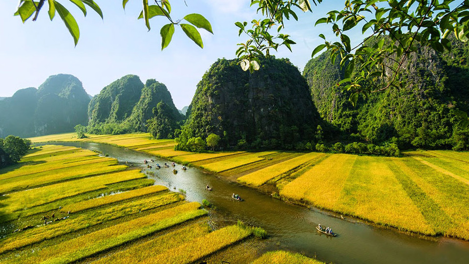 13h30: Visit Tam Coc by1.5-hourbamboo boat. You will be surprised by the charming beauty here with paddy fields, river, water, cloud, sky, and a stunning cave system during the boat trip. All make a masterpiece that the Vietnamese people called “Ha Long Bay on land”